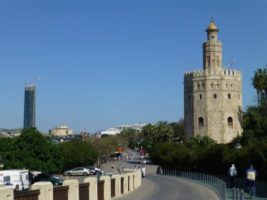 Among the most notable examples are the late 12th-century octagonal Torre Espantaperros in Badajoz, the Torre Mochada in Caceres, and the most famous of all, the remarkable 12-sided Torre del Oro (Golden Tower, above) in Seville, not far from the Cathedral. Built in 1220, the Torre del Oro now stands alone on the bank of the Guadalquivir, the wall to which it was originally attached –running from the Alcazar further inland– having been long dismantled.