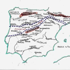 In these early years, their presence would have responded to the advances of the Moors (Muslim forces) who had entered Hispania (as the Iberian Peninsula was called then) near Gibraltar in 711 and swept swiftly northwards. By 720 they had taken virtually all the peninsula and established a major garrison in Zaragoza on the Ebro River, and others in an arc running roughly down through Medinaceli, Trujillo and Coria.