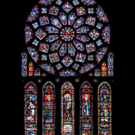 In many ways, stained glass was Gothic’s answer to Romanesque frescoes, and served a similar function: to teach as well as delight and move. Small illustrations of the lives of the saints and biblical scenes appeared in the chapel windows which were at eye level, but at the upper levels of the nave single, large figures were necessary for them to be visible.