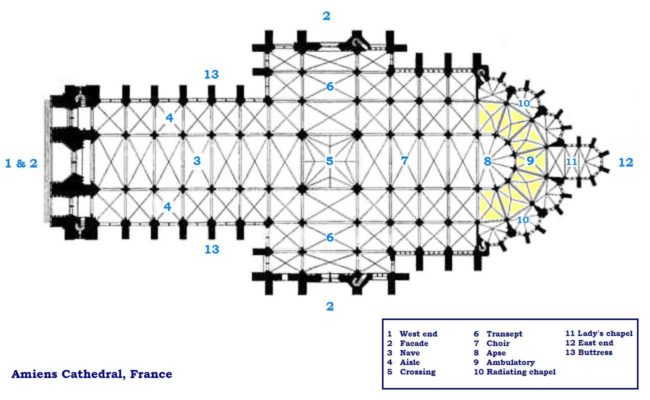 Floorplan of Amiens cathedral: “Amiens cathedral floorplan”. Licensed under Public Domain via Wikimedia Commons -http://commons.wikimedia.org/wiki/File:Amiens_cathedral_floorplan.JPG#/media/File:Amiens_cathedral_floorplan.JPG