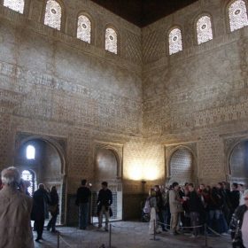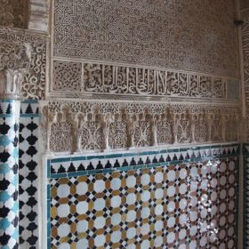 Standing two storeys tall, the walls of the Hall of Ambassadors are totally covered with intricate, multicoloured patterns beginning with the azulejos (tiles) at ground level, and followed upward by several levels of mesmerising stucco tapestries -reminiscent of oriental carpets- interspersed with Qur’anic and poetic inscriptions.
