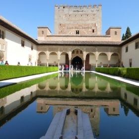 So, to get to the Hall of the Ambassadors, you climb a few steps through a narrow and darkened passageway, before emerging into dazzling sunlight at the Patio de los Mirtos or Arrayanes (Court of the Myrtles).
