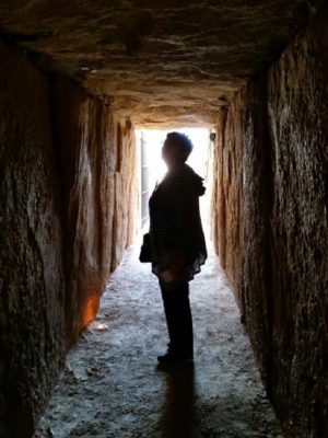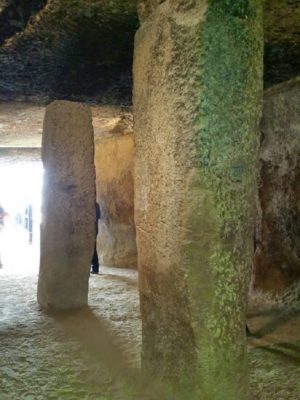 Reputed to be some 2500 years old, the Menga dolmen looks like an innocuous mound until we look at the entrance. A massive stone beam sitting astride the opening is a fitting prelude to the large chamber beyond: a chamber that is about 25 metres long, 4 metres high and 6 ½ metres wide, and made to look even larger by the sheer size the colossal roof slabs and vertical monoliths.