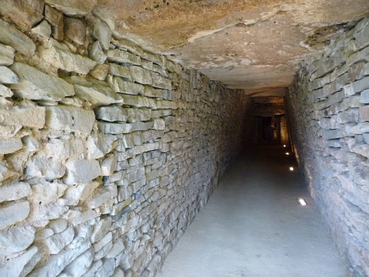 Some symbolic engravings and outlines of human faces near the entrance probably have some ritual significance, associated possibly with the sunlight that penetrates into the burial chamber at the summer solstice.