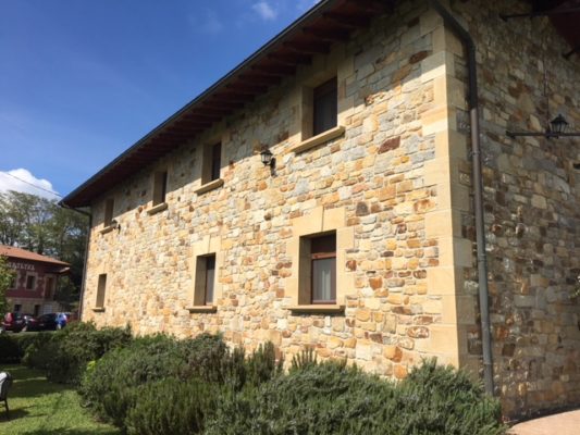 Still feeling somewhat tired after our transatlantic overnight flight, we decided against going back down to the city. Besides, it was now fairly late, and a meal seemed more in order. There are two Basque restaurants close to the hotel, one alongside (Asador –i.e. Grill—Artetxe) and the other across the road (Asador Berriz Txakoli). The choice was made for us. The Asador Berriz Txakoli was closed, so it was the Artetxe (despite the similarity of names, this Asador has nothing to do with the hotel). The dining room was cozy with patterned tablecloths and matching serviettes. The meal was tasty, but compared to meals over the next three weeks, it was overpriced (euros92: $142). It consisted of garbanzo soup with lobster (much more shell than meat, unfortunately), cogote de merluza (hake cheeks, the choicest part of the neck of the fish), accompanied by a lovely bottle of Txakoli wine, a slightly effervescent white still relatively unknown beyond the Basque Country’s borders.