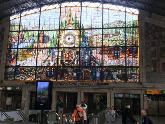 Our train rolled on time into Bilbao’s Abando Station, in the centre of the city, on time. Train stations are frequently ornate or powerful structures, a gateway to a city, and meant to immediately impress visitors. This was particularly so before the arrival of airports, which in many cases have now taken over this role (Bilbao’s airport, designed by one of Spain’s leading architects, Santiago Calatrava) is an example. See https://www.theguardian.com/culture/2000/nov/20/artsfeatures ).