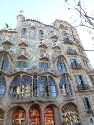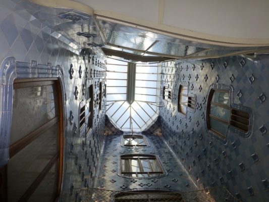 Casa Batlló is located on the elegant Passeig de Gracia, the first stop after leaving the Plaça de Catalunya. This part of the Passeig is a focal point of Catalan modernism with strikingly different buildings by contemporary architects, each daring in its way and portraying an iconoclastic/ adventurous spirit breaking with conventions (e.g. compare the Casa Amatller by Puig i Cadalfach immediately to the left of Casa Batlló). Gaudí combined modernism’s variegated decoration –using iron, ceramics and wood- with romanticism’s appreciation of tradition and empathy with nature.