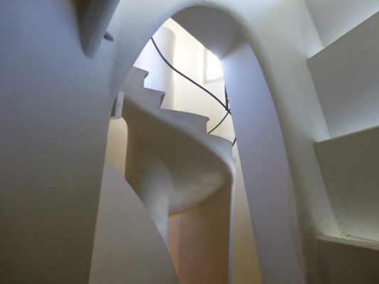 Look a little closer at the centre of the large window: those two long bone verticals are topped by a headless torso with arms folded over the chest. And running down beneath the undulating horizontal frame of the window and into the soft curved sandstone frames of the ground floor are four large nipple-like drips. Dripping blood? There’s a surreal feel to the front, which explains why Salvador Dalí –fellow Catalan and surrealist par excellence—admired Gaudí immensely.