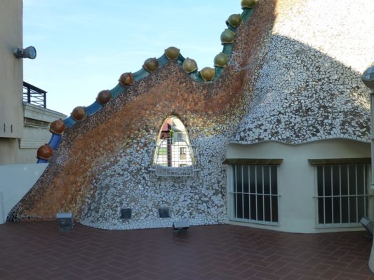 According to the art critic, Robert Hughes, the façade of Casa Batlló was intended to project publicly both Gaudí’s deep Catalan nationalism and religious conservatism. Gaudí allegedly said that the façade portrayed the victory of St George (patron saint of Catalonia) over the dragon. The knobbed outline of the roof represents the scales of the dragon’s back (which is much clearer if you go up to the roof), the masks and boned window dividers are remains of the monster’s victims, and the large window the dragon’s devouring mouth. Above, the tower that protrudes boldly to the left is the tip of St George’s lance, topped by a cross inscribed with the names of Jesus, Mary and Joseph.
