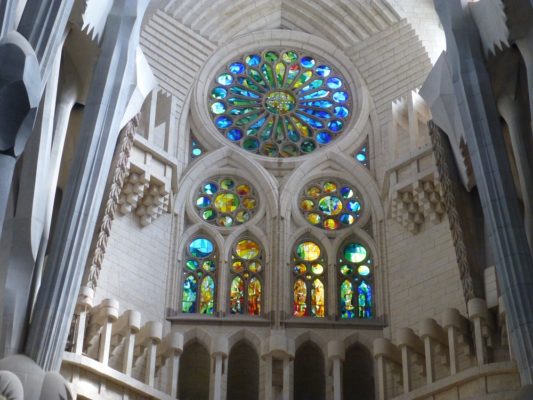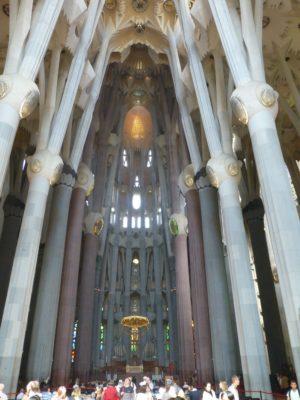Gaudí’s church is basically Gothic, overlaid with romantic freedom and modernist love of decoration. Romanticism followed several paths: amongst them a search for the medieval past, a reawakening of interest in local traditions, and nature. Gaudí takes the medieval Gothic cathedral as his starting point, and then adds endless structural and decorative elements based on his belief in the sanctity of nature as an expression of God’s omnipotence.