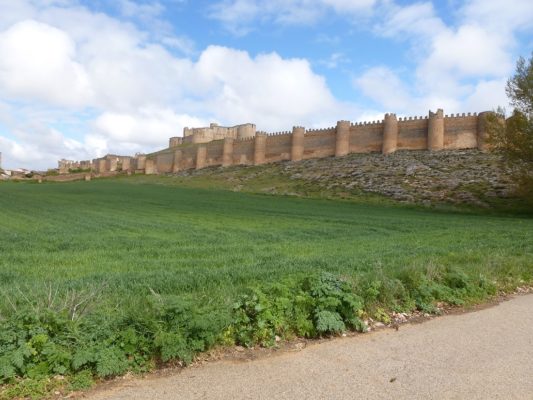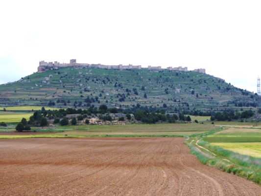 We left El Burgo de Osma early after a nice buffet breakfast at our hotel, II Virrey Palafox, and headed south on the C116 in the direction of the ancient town of Berlanga de Duero. The weather was again pleasantly warm, and the sky –although fairly cloudy—had enough blue for us to feel optimistic about the day. A rolling landscape of red earth, white pines, wild flowers and cereal crops flattened out as we approached the Duero River. After 24 kilometres/15 miles, we turned right and in a few minutes entered Berlanga, dominated by its massive 15th-century castle.
