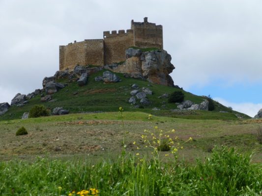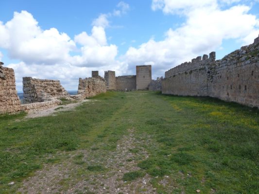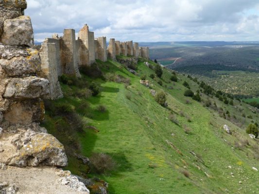 We next headed back to Berlanga and then took a minor road, the SO 160, towards El Burgo de Osma. As we approached the Duero River, we could make out an enormous crag topped by the silhouette of a massive castle. This was the Moorish castle of Gormaz, one of the largest castles in Europe and our next destination. A side road up took us through the tiny village of Gormaz, past its cemetery and the hermitage of San Miguel de Gormaz and then, turning sharply, climbed steeply up the rocky hillside to a parking lot below the castle’s main entrance.