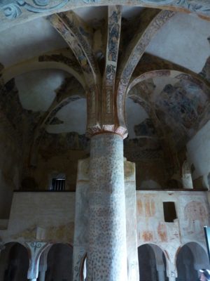 There has been a lot of debate about what they mean, and whether they are the work of one or more artists or come from one studio. What is clear is that there are two general themes to the paintings: the upper level frescoes draw on the life and death of Christ and the lower depict secular scenes such as hunting or falconry. On the choir wall above the series of horseshoe arches, there are unusual pictures of a bear, camel, and hunting dogs on hind legs, perhaps inspired by bestiaries popular at the time.
