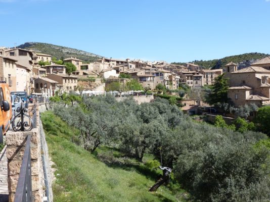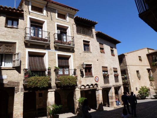 Our hotel was situated mid way between the more residential eastern part of the village with its narrow alleys and quaint Plaza Mayor (main square), and the western side consisting mostly of the main street into the village and its numerous cafes. Exiting the hotel, we turned first to the right and down towards the main street. The curve of the village faces south and receives the full impact of the sun. Golden-coloured brick and stone buildings housing restaurants, cafes, hotels, lined the north side of the street. Quaint chimney-pots, clay-tiled roofs and brown wooden balconies added a welcoming touch.