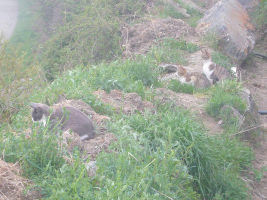 After such a wonderful meal, a walk was in order.El Corral del Castaño was fairly close to the far end of the village from our parking lot, and it took us only a few moments to find the path that we had followed on our way down to the barranco on previous visits to Capileira. The mist still hung around, and we couldn’t see down to the barranco, but it didn’t matter. It was a nostalgic walk, and we only strolled a couple of kilometres or so. But it was lovely to see that the path had not changed, the chestnut trees were still there, the almonds were in flower, the water channels flowed beside us following their allotted courses, the old cortijo still stood in its minute fields, we could still hear goat bells, and the cats we met were probably descendants of those which had greeted us on earlier visits.