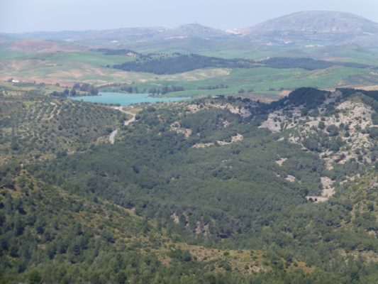 From Bobastro our road took us almost to Ardiles, where it joined the A 357 heading for Campillos. For several kilometres, we skirted two (of the three) reservoirs created by the Guadalteba-Guadalhorce dam. Approaching Campillos, we could see, silhouetted in the distance to our left, the castle of La Estrella perched above the hilltop town of Teba. Soon we were bypassing Campillos, an agricultural and leather manufacturing centre. The town seemed to be prosperous, with new buildings and (rather unattractive) row houses, but whether they were occupied is another matter. The construction boom that collapsed in 2008 left thousands of buildings unfinished or empty as contractors ran out of funds or buyers were simply unable to keep up payments.