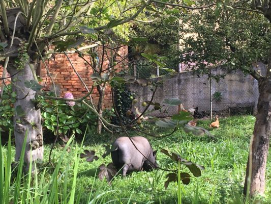 Next to it, in an orchard, a black pig was busy snuffling for figs under a fig tree accompanied by some chickens rooting for worms. Under a sunny sky, they were having a good time.