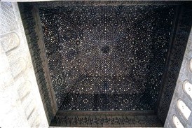 The ceiling, too, conveys a similar message. It is a magnificent artesonado (wooden recessed –coffered—ceiling) cupola made up of over 8,000 pieces of wood. It looks like a never ending display of fireworks, exploding simultaneously against the night sky. Half stars along the edges suggest infinity and man’s finite reach, i.e. the impossibility of ever containing the heavens within human dimensions. The whole ceiling is awesome and beautiful, and probably had a functional role of transferring some of that awe to the person who sat beneath it: the king beneath the dome of heaven, so to speak.