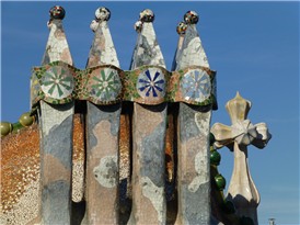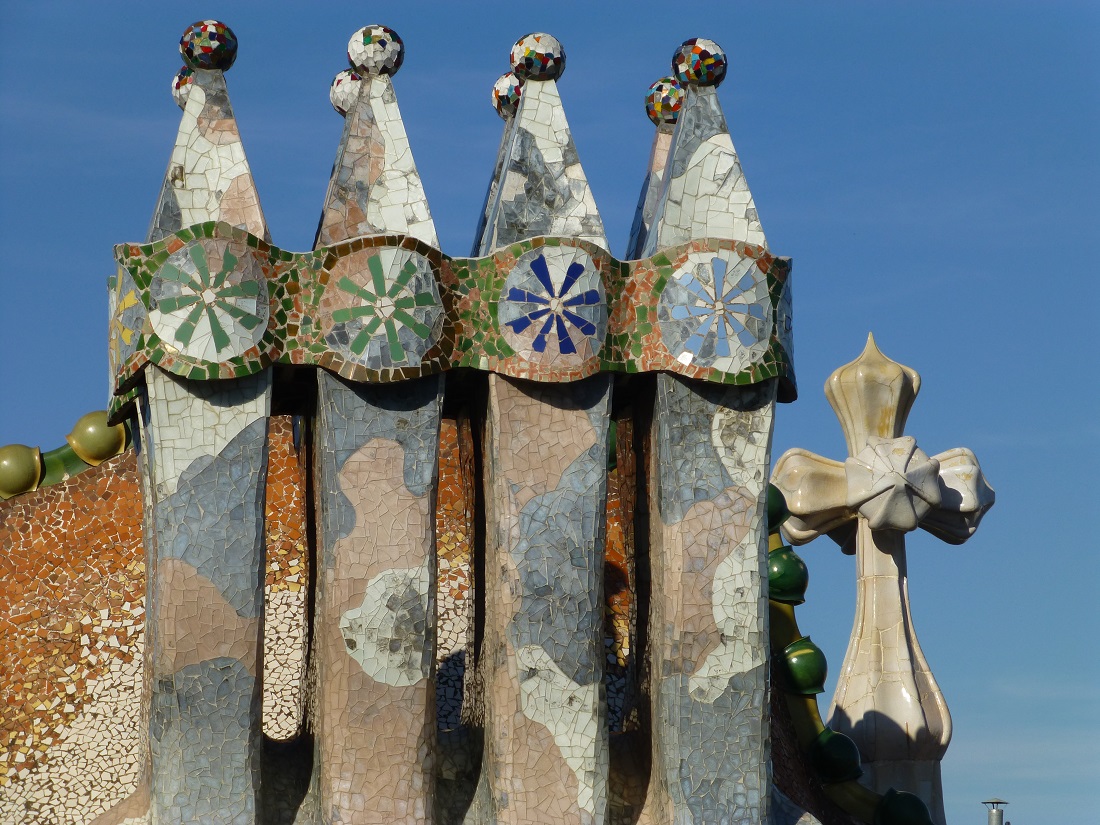 Inside, Gaudí’s buildings tend to be intimate and warm, a combination of curves and colours, with ample use of tiles, wrought iron, and stained glass. Ceilings curve or undulate and roofs are topped by imaginative, even whimsical chimneys.