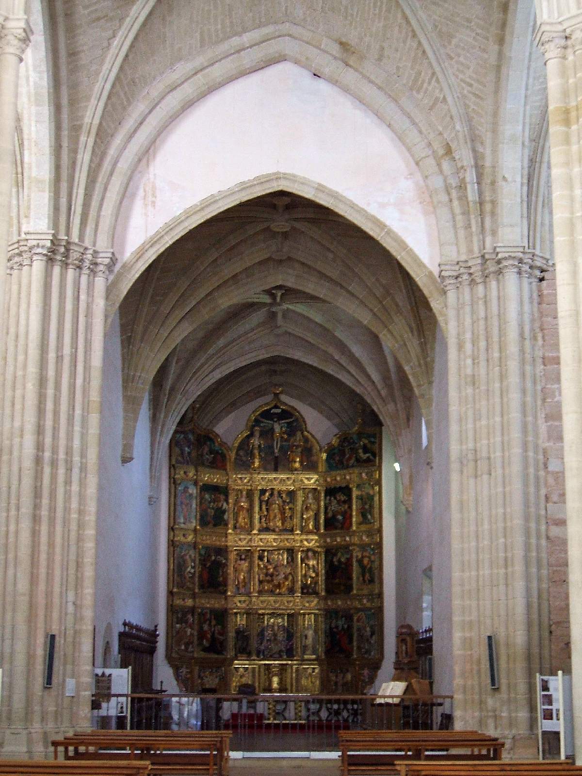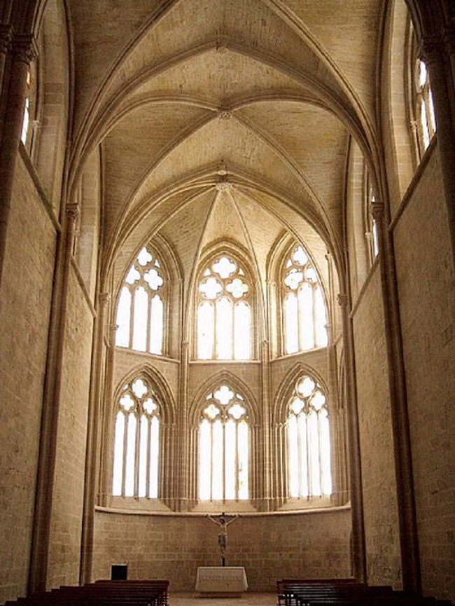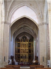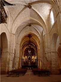 The Monasterio of Cañas (1236) is really simple, non-decorative Gothic with its large of expanse of glass, its pointed arches, ribbed vaulting and elegant upward thrust. In keeping with the simplicity sought by the Cistercians, the windows are not made of stained glass and there are no carvings or sculpture. The ornate altarpiece in the upper right is a 16th-century addition and clashes with the serene simplicity of the rest of the interior.