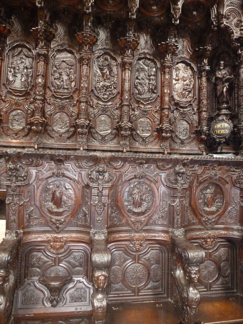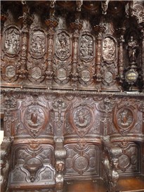 Part Gothic, part Renaissance, with ornate 18th-century baroque carvings in mahogany on the choir stalls and two pulpits, the church breathes the spirit of Catholic orthodoxy. Here words are superfluous, virtually non-existent. There is a centralised forward focus on the altar, upward movement of the eye through vertical lines and pointed arches, figural representations from the Bible or of saints both in painting and sculpture, a story line everywhere, even on the choir stalls (with Biblical motifs, scenes from the life of the Virgin Mary and figures of Cordoban martyrs). Even the ceiling --divided into rectangles, triangles and semicircles-- is filled with various religius motoifs.