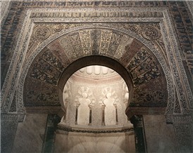 In the Mosque of Córdoba, the horseshoe entrance to the mihrab and its surroundings are the most sumptuous part of the mosque. They were built by al-Hakam II between 962-66 as part of the thirdextension to the mosque, and their splendour befits al-Hakam’s status as caliph** and Córdoba’s claim to the caliphate (first established by his father, Abd al-Rahman III).