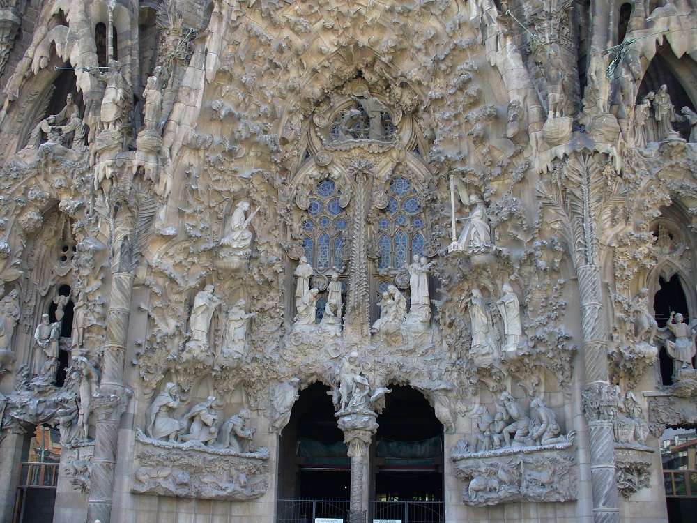 What strikes us immediately is the abundance of sculpted human and animal figures (for which Gaudí was helped by his assistants) and the ornate, exuberant vegetative forms that surround and weave their way between the sculptures and cover every inch of the facade.