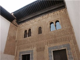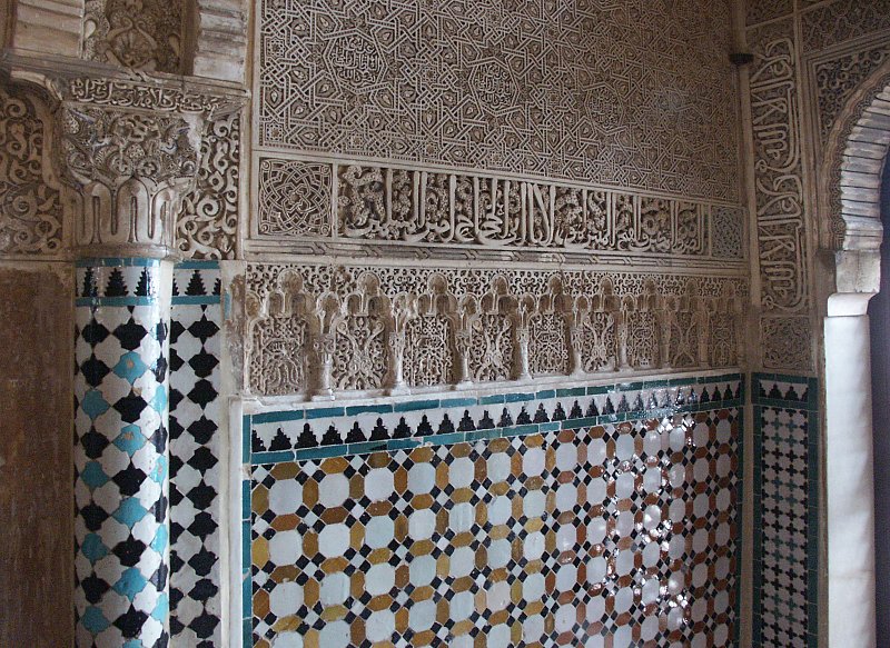 Standing two storeys tall, the walls of the Hall of Ambassadors are totally covered with intricate, multicoloured patterns beginning with the azulejos (tiles) at ground level, and followed upward by several levels of mesmerising stucco tapestries --reminiscent of oriental carpets-- interspersed with Qur'anic and poetic inscriptions. The thick walls are broken up at ground level by deeply recessed and decorated alcoves/windows with commanding views of the ancient whitewashed Albaicín quarter across the ravine. Near the ceiling, rounded, delicately latticed windows filter the sunlight as it travels along on the walls. The ceiling itself is a tour de force: an artesonado cupola made up of over 8,000 pieces of wood representing the seven heavens of Paradise. It looks like a galaxy of shooting stars, or a never ending display of fireworks, exploding simultaneously against the night sky. Half stars along the edges suggest both infinity and man’s finite reach, i.e. the impossibility of ever containing the heavens within human dimensions.