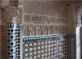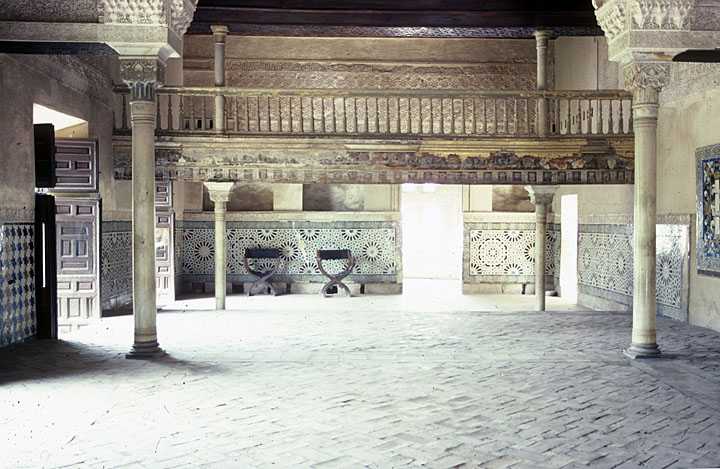 Visitors entering the Nasrid Palace do so by way of the Mexuar, in all likelihood a council room where citizens might have their grievances addressed by administrators or possibly the ruler himself. A low, modest room, the Mexuar has undergone radical alterations over time, and little remains of the original chamber. For example, the wooden ceiling belongs to the 16th century and most of the early tiles (azulejos) have been replaced by tiles from other parts of the palace. Under Charles (Carlos) V, the Mexuar was lengthened and turned into a chapel; at the same time, a gallery was added and Charles’s emblem (the Pillars of Hercules) and motto (Plus Ultra) inscribed in the walls, alongside the Nasrid coat of arms. In the 17th century, a wooden choir gallery was added at the northern end of the room.