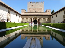A rectangular pool –imitating the shape of the Court—magically gathers the shimmering reflections of the surrounding walls and pillars. But see it at night, too, if possible –and the Alhambra should be seen at night as well as in daylight-- when the moon or stars reflected on the pool’s glistening surface seem to leave the surrounding buildings suspended in the heavens.