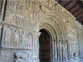Although inspired by Benedictine-style architecture emanating from Cluny that typified the design of churches in Castile-Leon, Santa María de Ripoll retains the Catalan characteristics noted above: it has no semi-circular ambulatory with radiating chapels, and its multi-storeyed tower betrays the influence of Lombardy. Its greatest feature, however, is the magnificent west portal, a vast tableau of Biblical figures and grotesque monsters in six horizontal layers framing the multiarched, richly ornamented doorway (now protected by a glassed-in porch).