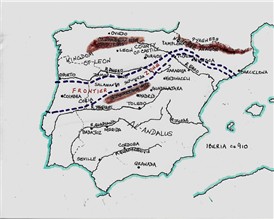 By 910 the frontier zone had moved south, roughly from below the Duero to south of Coimbra and then following a north-east trajectory along the northern side of the Guadarrama mountains to Tudela and Huesca and from there to the coast just south of Barcelona (See map below).