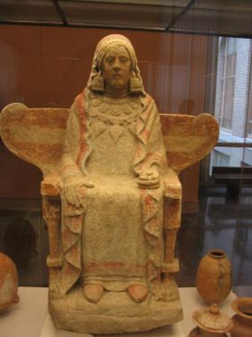 Another statue discovered in a tomb near Jaén in 1971 is an equally remarkable sample of Iberian achievement. Called the Dama de Baza, this full length statue enthroned in a wide-winged chair looks more like a matriarch --with her simple, rounded headdress and serenely enigmatic look-- than the elegant Dama de Elche. From the Dama de Baza's ears hang weighty earrings, and her neck and chest are adorned with heavily carved jewellery. A full length robe adds to the matronly quality. Her down-turned lips suggest a tinge of sadness, perhaps even of slight disapproval. In any case, it is a more expressive face than that of her more famous companion. The reddish colour on the robe and on the chair suggests that originally the entire statue was richly painted; the same was likely the case for the Dama de Elche.