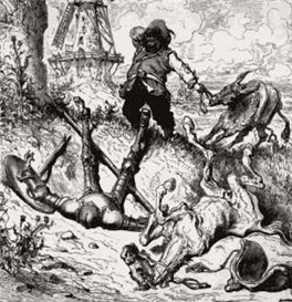 First described as “not too bright” (“de muy poca sal en la mollera”), Sancho actually turns out to be canny, shrewd, and practical, and a perfect foil to his master.A proud "old Christian" **(I, 21, 47, II, 3, 4), he is persuaded to accompany Don Quixote only because he has been promised an island to govern (I, 7). The first adventure they share is the famous windmill episode (I, 8). From a distance Don Quixote sees what he believes to be giants. Sancho sees only windmills. The result is one of the most iconic scenes in literature, provoking immediate laughter. But it is more than pure comedy; it also establishes one of the basic themes that Cervantes examines throughout the book: what is reality? Sancho is necessary for this because he provides another voice that questions and challenges what Don Quixote sees. (Don Quixote blames the windmill debacle on enchanters, and tells Sancho to shut up (“Calla, amigo Sancho”) reminding him at the same time of his ignorance of romances of chivalry.)