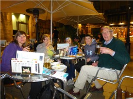 By the time JLAA were settled in El Jardí it was late, but despite their transatlantic overnight haul from Vancouver to Barcelona via London, they weren’t yet ready for sleep. So about 10.00 p.m. --a typical Spanish dinner hour-- the six of us were seated in Sant Josep sampling more tapas (patatas bravas: deep-fried potato chunks with spicy sauce, and calamares a la romana: rings of squid in light batter), and reflecting on our respective journeys (Margaret and I were staying overnight near Boston when the tragic Boston marathon bombings occurred).
