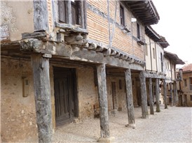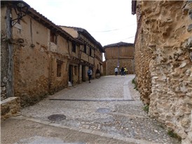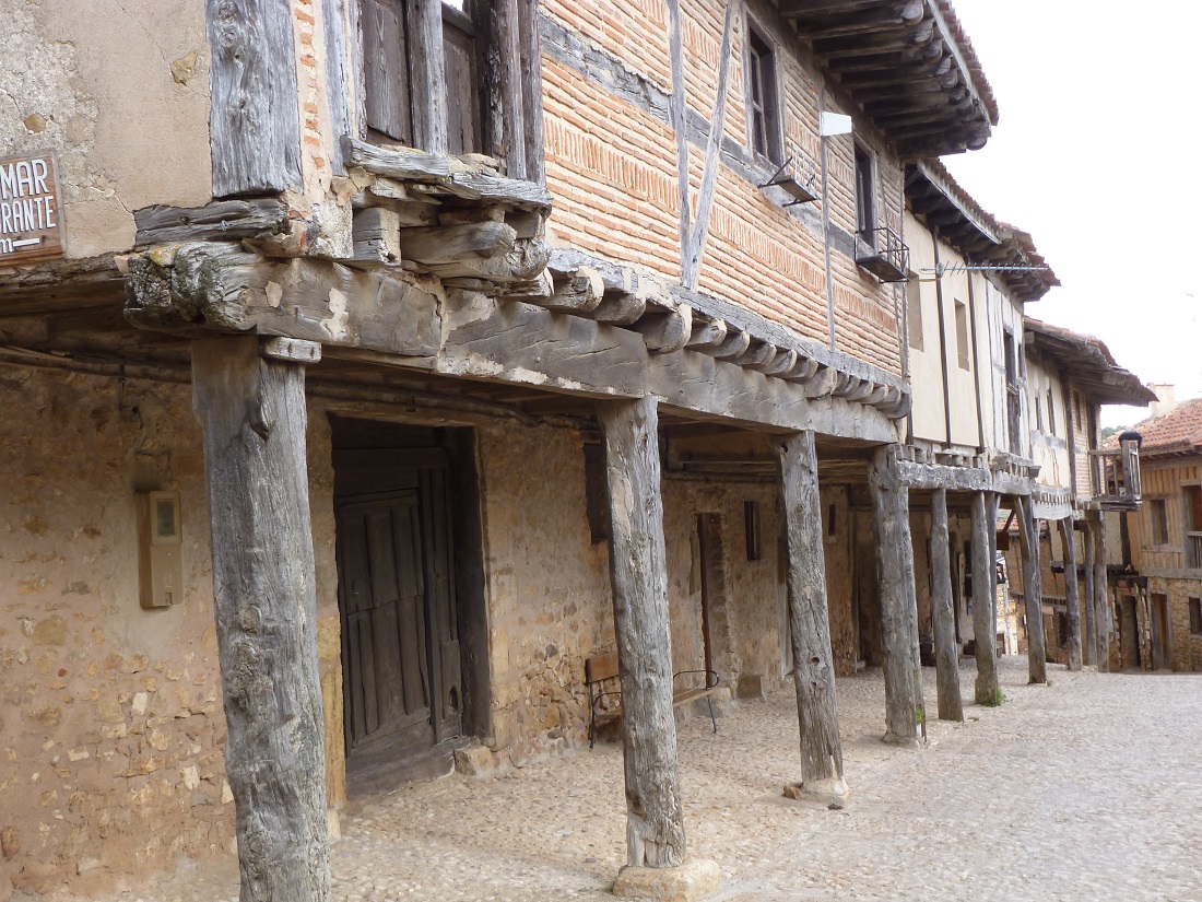 We walked up a fairly steep, winding road under a cliff and, once around the cliff, found ourselves climbing the cobblestoned main street (Calle Mayor). The houses –some dilapidated and tilting— were made of clay and rough stone with exposed beams; further up we passed under crooked wooden arcades. We walked slowly, taking in the medieval atmosphere. Not surprisingly Calatañazor has been the location for several movies/ films (probably the most famous is Orson Welles’s Chimes at Midnight, based on Shakespeare’s character Sir John Falstaff).