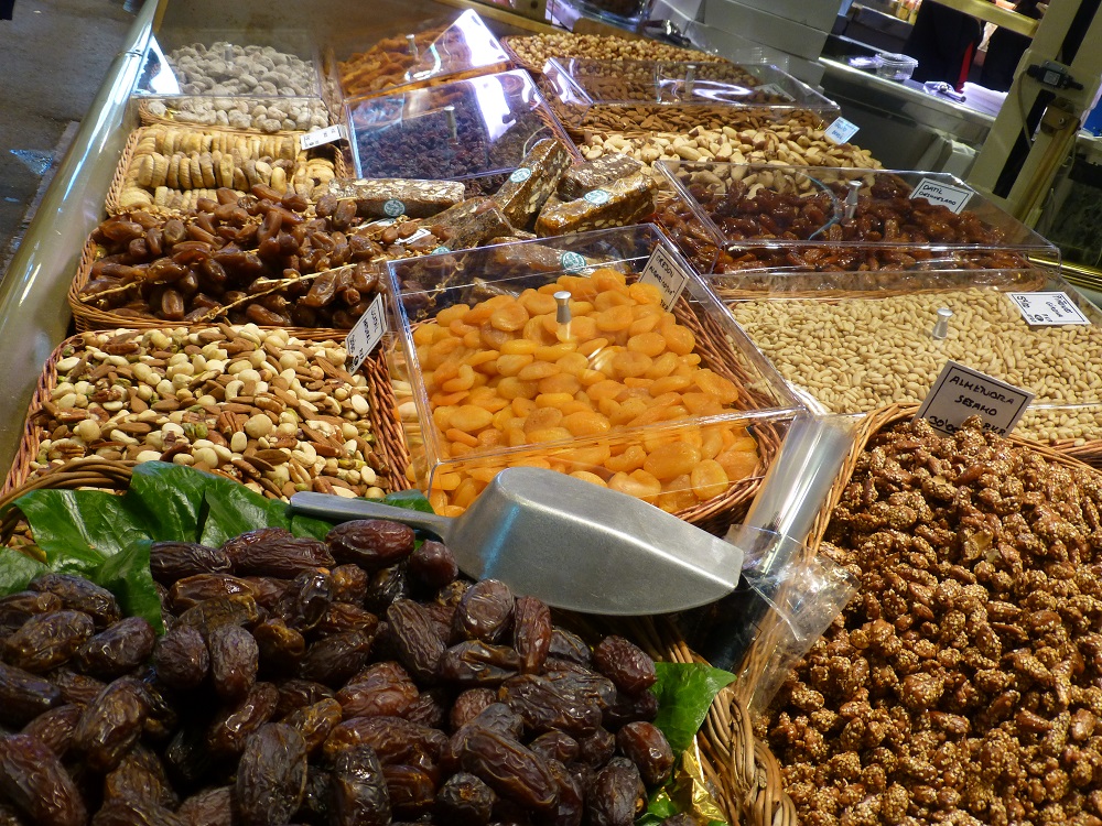 The Boquería is on the Ramblas, towards the Plaça de Catalunya end. As soon as you walk in all the senses are alerted. The eyes feast on an incredible selection of vibrantly coloured foods (fruits, vegetables, fish, meat) arranged with care and artistry, the taste buds begin to salivate, your nose quivers at the array of aromas, and you can’t help touching the delectable displays (you might get frowns from the vendors!). Temptation is everywhere, and you won’t leave without buying something!