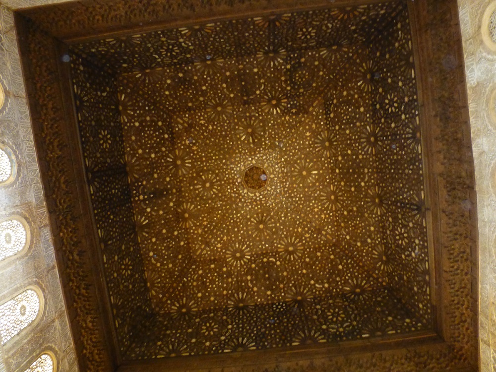 As for impressions of this latest visit, I found I was comparing it unfavourably with earlier visits. The buildings themselves still enchant, but it was difficult to stand back and simply enjoy the beauty of this remarkable complex with people constantly bustling and jostling for position to take photos or be photographed. Fortunately, once inside the Royal Residences, we were under no pressure to hurry through, and I was really pleased that the authorities hadn’t (yet) erected barriers or ropes to prevent us getting as close as possible to just about everything (exceptions: the very centre of the Hall of the Ambassadors and the fountain in the Court of the Lions). Without barriers, it’s easier to examine and admire the sophisticated ornamentation adorning the stuccoed walls: the wainscoting of bright, patterned tiles (azulejos), topped by intricate arabesques, and framed by beautiful, cursive Arab calligraphy. And don’t miss the ceilings: especially the star-spangled wooden ceiling of the Hall of the Ambassadors and the stuccoed “exploding stars” in the Hall of the Abecerrajes and the Hall of the Two Sisters (both in the Court of the Lions).