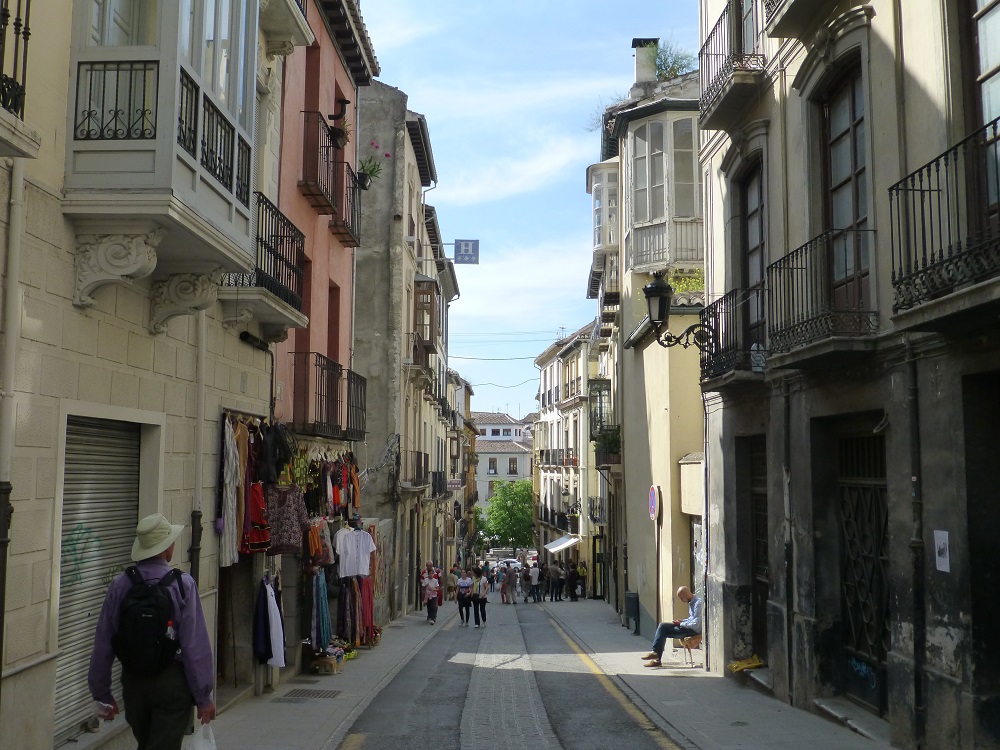 Although fairly tired after sightseeing and side-stepping other tourists, we decide to walk back to our hotel. So it was back to the Gate of Justice and downhill, under the shade of elms and cypresses, and accompanied by streams that gurgled down beside us. Once through the Gate of Pomegranates we were in Cuesta de Gomérez Street. The nature of the street has changed drastically since we were last in Granada, when it was the main access to the Alhambra. Then the street bustled with activity as tourists purchased souvenirs and typical goods from the shops that lined it. It’s now a shadow of its former self, although there are still some great shops to buy souvenirs, including some where you can watch artisans craft their elaborately decorated marquetry (e.g. boxes, trays, chairs), wrought-iron work or boldly painted ceramics. Still, ask them how things are going and they’ll shake their heads sadly.