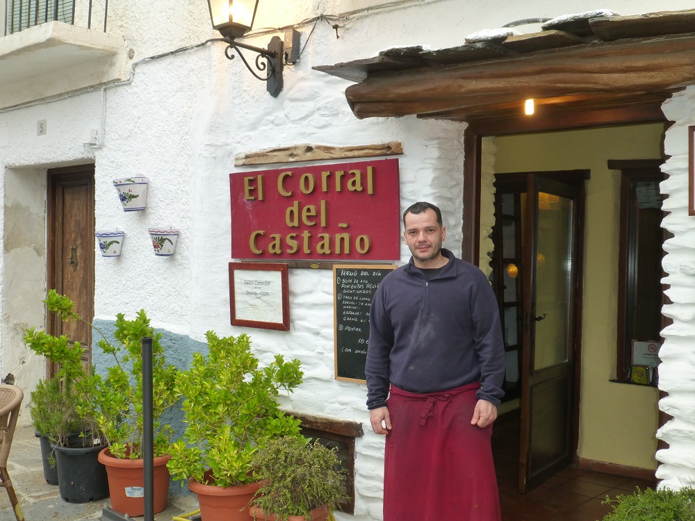 After shopping it was time for lunch. Following a recommendation by José Moreno, we headed for the nearby Corral del Castaño (Castaño = chestnut tree). We would have liked to eat on the terrace, but the mist still hung around, like an unwelcome guest. It was a Monday, and we were the only customers. The room was warm and intimate (there were actually three dining rooms in this 18th-century building) and we were shown to two neighbouring tables near the fireplace. And so began a gastronomic adventure against which we measured all the subsequent meals of our trip. Using local produce whenever possible, Manuel, chef and co-owner, made every dish an experience: tempting cheese croquettes for starters, tasty almond and garlic soups, exquisite green salads, and the piece de resistance, a superb paletilla (shoulder blade) of lamb, accompanied by an excellent Rioja red and bottled water (from where else but Lanjarón). Dessert was mini éclairs with strawberries and a chocolate sauce sprinkled with sliced almonds: mouth-watering! The service was attentive and very friendly, table settings and tablecloth immaculate. There really was nothing to fault here. Not surprising that El Corral del Castaño is Michelin recommended (NB. Closed on Wednesdays, according to business card).