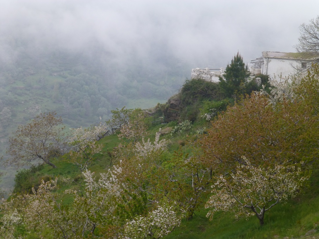 After such a wonderful meal, a walk was in order. El Corral del Castaño was fairly close to the far end of the village from our parking lot, and it took us only a few moments to find the path that we had followed on our way down to the barranco on previous visits to Capileira. The mist still hung around, and we couldn’t see down to the barranco, but it didn’t matter. It was a nostalgic walk, and we only strolled a couple of kilometres or so. But it was lovely to see that the path had not changed, the chestnut trees were still there, the almonds were in flower, the water channels flowed beside us following their allotted courses, the old cortijo still stood in its minute fields, we could still hear goat bells, and the cats we met were probably descendants of those which had greeted us on earlier visits. If you are ever in Capileira, do look for this path; you won’t be disappointed.
