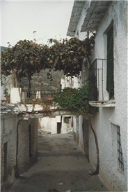 We bypassed Bubión, where Margaret and I had rented a rustic cottage in 1988, and stopped at a small parking lot at the entrance to Capileira. Capileira cascades down the upper part of a hill which then drops vertiginously down to the Poqueiro ravine. In the steepest areas of the village, parts of streets pass under the terraces of the houses above, a characteristic of North African villages which can be found in many of the hillside villages of the region. Wandering through some streets, I was happy to see that Capileira hadn’t really changed: the same narrow, rough-paved streets, cube-shaped whitewashed houses with capped chimneys, geraniums covering narrow balconies or balanced on window ledges, hidden corners with fountains …